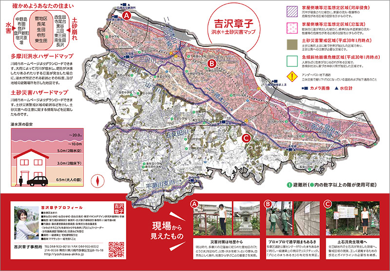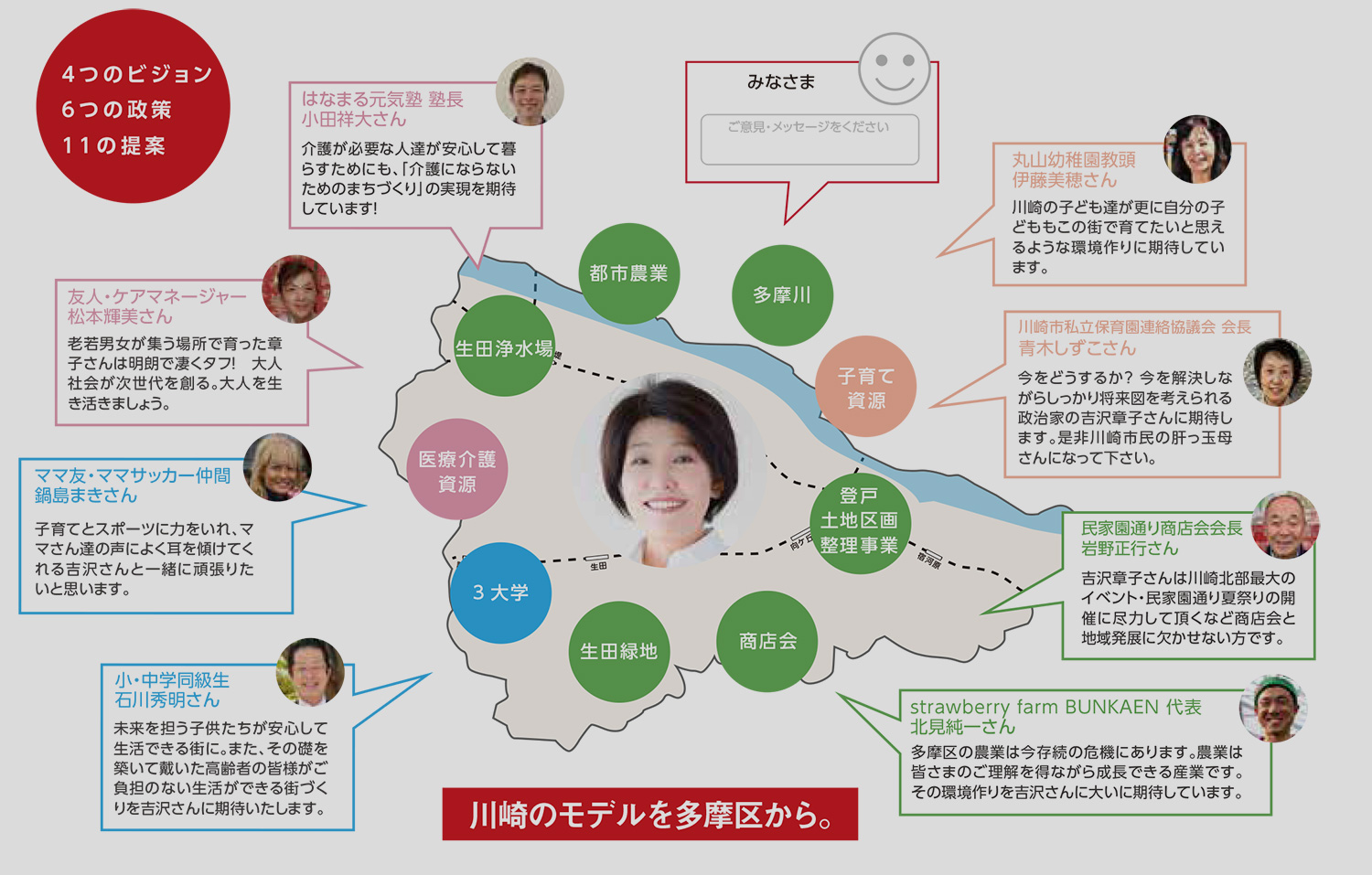 環境と共生し、災害に強いまちづくり。子どもが主体の教育・子育て環境の整備。 将来にツケを回さない財政。医療・介護の最適化。地域資源による経済活性化。真の女性活躍。環境と観光の多摩区。等々について政策提言。是々非々の姿勢を貫いてきました。